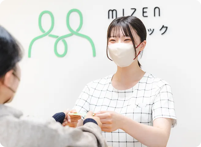 MIZENクリニックのロゴは、病気を未然に防ぐ予防医療のために、患者さんと医師が一本の糸で寄り添い、コミュニケーションを取ることの重要性を表現しています。シルエットは「MIZEN」の「M」を象徴しています。
