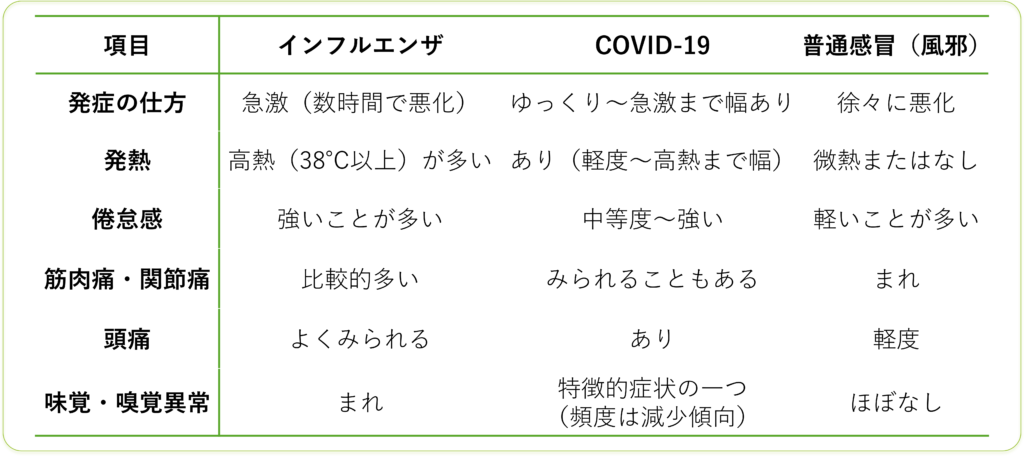 一方で、こうした症状はCOVID-19や一般的な風邪(普通感冒)でも広くみられます。いずれもウイルス性上気道感染症であり、発熱、のどの痛み、咳、鼻水といった症状は共通して出現するため、症状のみから明確に区別することは容易ではありません。臨床的には、症状の出方や強さ、経過の違いなどからある程度の傾向を捉えることは可能ですが、個人差も大きく、あくまで参考情報として捉えることが重要です。確定診断には検査が必要となる点も踏まえて理解しておく必要があります。以下に、一般的に説明される各疾患の症状の傾向の違いを参考としてまとめます。