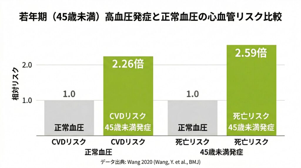 若い年齢で高血圧を発症することは、長期的な健康リスクの観点からきわめて重要な問題です。大規模なコホート研究の統合解析によれば、45歳未満に高血圧を発症した人は、正常血圧の人と比べて心血管疾患(脳卒中・心筋梗塞など)の発症リスクが2.26倍、全死因死亡リスクが2.59倍に達することが示されています(Wang et al., 2020)。
